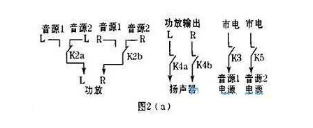 2.音源选择:按开/选择键,IC2第13脚先输出低电平,使红色LED6点亮作电源接通显示,并使V4导通,K1得电吸合,将功放电源接通。3秒后第13脚恢复为高电平,第14脚转为低电平,使绿色LED7点亮作音源1接通显示,V5导通,使K2、K3得电吸合,接通图2(a)中的音源1信号和电源。因VD2作用,V4仍导通,使K1吸合接通功放电源。同时经VD8也使K4得电吸合接通扬声器。