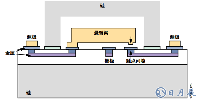 下图是该开关的横截面示意图。它是一种三端子配置的静电 驱动悬臂梁式开关。其在功能上类似于场效应晶体管 (FET),端子可用作源极、栅极和漏极。
