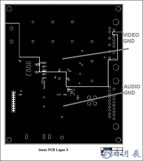 实际应用中最好将音频部分的地线和视频部分的地线隔离开。如图2所示,通过将顶层板下端的引脚GNDAUD和GNDVID相连,连接音频地和视频地。数字地与音频地、视频地应采用星型连接。如图3所示,如果用J3将MAXQ2000评估板的I2C接口和MAX4397评估板相连,数字地即可连接在正确的位置。