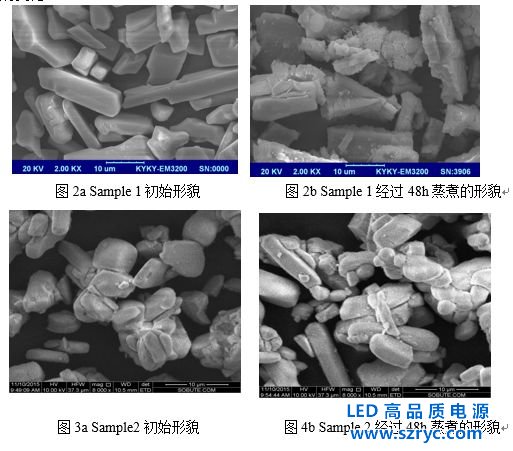 图2a、2b和图3a、3b分别显示sample1和sample2红粉样品初始形貌和经过48h蒸煮处理后的形貌。通过对比形貌可以非常直观的判断出荧光粉形貌上发生了不同程度的变化。其中sample1样品在经过48h蒸煮后,荧光粉晶体发生严重开裂,并且呈现为层状解理,表明晶体发生严重的劣化;而sample2的形貌基本没有发生变化。实际上我们通过观察粉体体色也可以非常直观的看出sample1的体色明显变淡,而sample2样品基本没有变化。