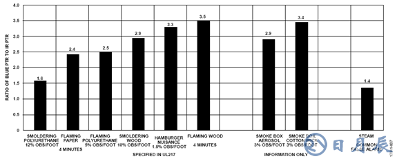 图5和图6中的数据表明,有效的烟雾报警器阈值必须根据PTR最低的燃烧聚氨酯测试的灵敏度来设置,因而是所有测试过的烟雾源中响应最小的。汉堡包干扰测试定义了防止误报的灵敏度下限阈值。相对于燃烧聚氨酯,每种其他类型的烟雾都有高得多的响应。如果适当设置阈值以在聚氨酯燃烧时报警,则对于UL217标准中定义的所有其他有效类型的烟雾,烟雾探测器都会触发警报。对于响应更高的烟雾,如阴燃聚氨酯或燃烧的木材,警报灵敏度水平大大超过了UL217要求。来自图5和图6所示的两个烟盒测试的数据仅作为参考。这些测试不代表现实世界的烟雾探测场景,并且未包括在任何阈值设置过程中。UL217未规定这些测试的绝对检测要求。