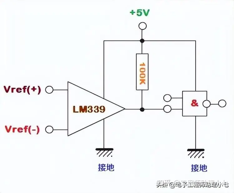 这里电路中两个电压的比较可以通过 LM339 来完成,输出为 V0,电路由单电源 VCC供电。两个电压之间的比较可以基于以下条件进行。