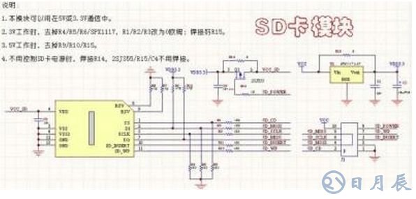 6.SD卡模块电路(带锁):本电路与SD卡的封装有关,注意与封装对应。此电路可以通过端口控制SD卡的电源,比较完善,可以用于5V和3.3V。但是要注意,有些器件的使用,5V和3.3是不一样的。