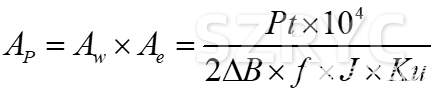 式中,AP单位为mm4,Aw为窗口面积,Ae为磁芯的截面积,如图2.3。ΔB为正常操作状态下的最大磁通密度(单位:特拉斯(T))。为了防止磁芯因高温而瞬间出现磁饱和,对于大多数功率铁氧体磁芯的尺寸越大Ae越高,所做的功率就越大。