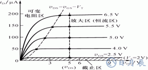 与三极管的特性相似,也可分为3个区:可变电阻区,放大区(恒流区、饱和区), 截止区(夹断区)。可变电阻区管子导通,但沟道尚未预夹断,即满足的条件为: