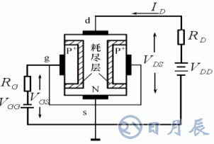 在N区两侧扩散两个P+区,形成两个PN结。两个P+区相连,引出栅极g。N体的上下两端分别引出漏极d和源极s。