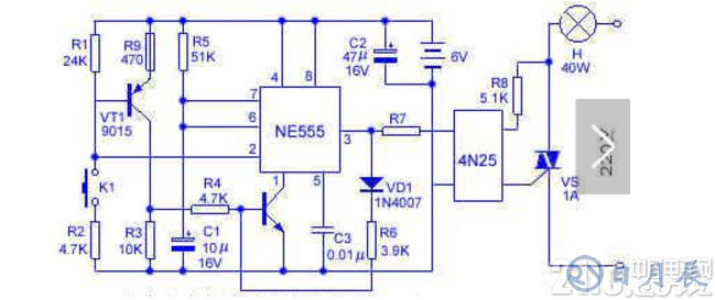 一盏延时式床头灯,对于许多读者在夜晚使用是很方便的。本文介绍的按键式床头灯能安全和方便的要求,电路原理如下图所示。