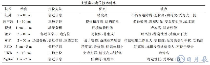 在精度、定位方法、实例和优缺点等方面对当前比较成熟的几种室内定位技术进行对比,从宏观上掌握室内定位技术领域发展的方向和目前研究的瓶颈问题。