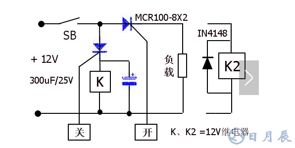 触摸一下金属片开,SCR1导通,负载得电工作。触摸一下金属片关,SCR2导通,继电器J得电工作,K断开,负载失电,SCR2关断后,电容对继电器J放电,维持继电器吸合约4秒钟,故电路动作较为准确。 如果将负载换为继电器,即可控制大电流工作的负载。