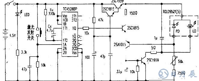激光枪电路如下图。在玩具枪内装入激光二极管、凸透镜、驱动电路及电池,构成激光枪。为使激光只发射一瞬间,使用了单稳态多谐振荡器TC4528,当输入端lA的电平由“L”变“H”时,其输出端lQ就瞬间输出“H”,这一瞬间的长短由Rx、Cx确定。为安全起见激光的输出功率被控制在lmW以下。