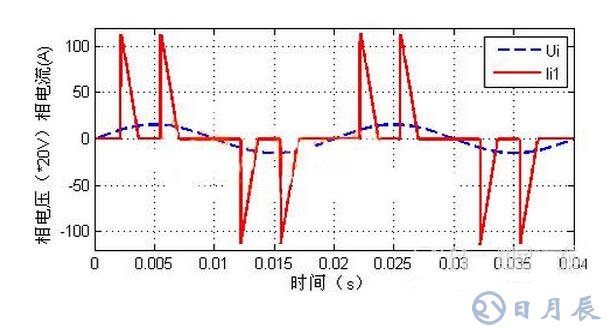 图2 大电容滤波的三相不控整流电路输入电压电流波形