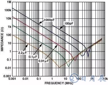 图1示出了采用多个并联电容器的优点。在低频段,大的电容器提供低阻抗的接地通路。但是一旦频率达到了它们自身的谐振频率,电容器的容性就会减弱,并且逐渐呈现出感性。这就是为什么采用多个电容器是很重要的原因:当一个电容器的频率响应开始下降时,另一个电容器的频率响应开始其作用,所以能在许多十倍频程范围内保持很低的AC阻抗。