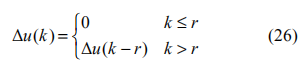 对执行器时延系统,基于动态矩阵控制思想改进传统 MPC 算法。将增量控制输入视为阶跃输入,则执行器时延对应系统阶跃响应系数的时延,进而转换为控制输入的时延。故执行器时延为θ 的系统相当于具有纯滞后