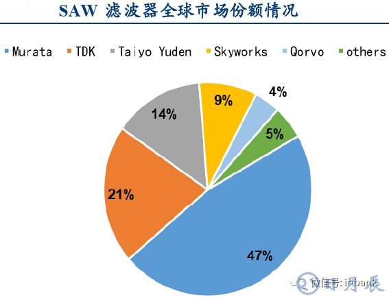 全球SAW滤波器市场份额前五位的厂商分别为村田(47%)、TDK(21%)、太阳诱电(14%)、Skyworks(9%)、Qorvo(4%),合计占比达95%。国内SAW滤波器的厂商有麦捷科技、德清华莹(信维通信入股)和好达电子等。