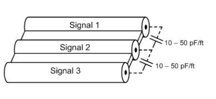 正如采用绝缘体隔离的任何其它导体一样,任何相邻布线的两条电线都会在其之间产生电容。根据所用的线规和绝缘体材料,大部分标准带状线缆及电线会在电线之间产生10至50pF/ft的电容,如下图1所示。