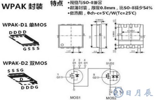 WPAK是瑞萨开发的一种高热辐射封装,通过仿D-PAK封装那样把芯片散热板焊接在主板上,通过主板散热,使小形封装的WPAK也可以达到D-PAK的输出电流。WPAK-D2封装了高/低2颗MOSFET,减小布线电感。