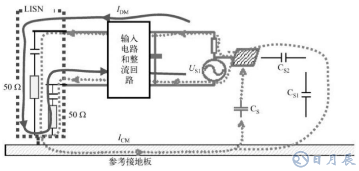 当阻抗50 Ω一定时,电源端口传导骚扰的实质也可以理解为流过这个50 Ω阻抗的电流的大小。在实际产品中有两种电流会流过这个50 Ω阻抗,一种是图4 中的IDM,另一种是图4中的 ICM。无论是IDM还是ICM,都会在接收机中显示出测试值,而接收机本身无法判断是哪种电流引起的传导骚扰。这需要设计者去控制与分析。控制产品中的骚扰电流不流过LISN和接收机并联组成的50 Ω阻抗是解决电源端口传导骚扰问题的关键。通过大量的实践证明,大部分的电源端口传导骚扰问题产生于ICM,它是一种共模电流,分析其路径和大小有着极其重要的意义。