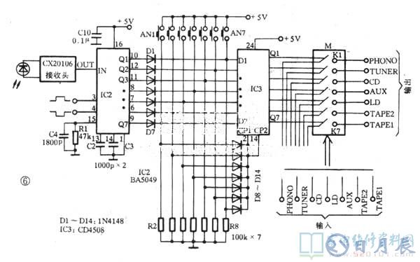 按下发射器上相应键后,Ic2的Q1~Q7相应的输出端输出正脉冲。例如,按一下cD键,Ic2 11脚输出一正脉冲,此正脉冲经二极管到IC3的D3端,同时也作用到cPl、cP2端。Ic3在其上升沿作用下接收D3端数据“1”,并在脉冲过去后锁存此数据,则有Q3=D3=“1”,M组件中K3接通,信号切换为cD信号。ANl~AN7为本机操作键,用于手动切换。这里M组件中K1~K7由用户自己选取,可以使用晶体管、继电器,模拟电子开关cD4066等,使用微小型继电器时,可以不失真地传送信号。