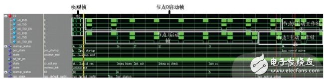 从仿真波形中可以清楚地看出FlexRay状态机制的变化过程。当节点的收发器接收到唤醒特征符后,对主机处理器和通信控制器进行上电,唤醒并激活通信控制器、总线驱动器和总线监控器。节点0被唤醒后,将返回唤醒完成信号,并处于等待启动状态。接着节点1收到唤醒信号,返回唤醒完成信号,节点1进入启动状态,节点0也进入启动状态,最终都进入主动工作状态,开始状态机循环,显示FlexRay总线接口工作正常。