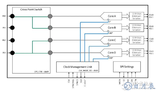 另外,EV12AQ605包含一个交叉点开关(CPS),可使器件内部的四个核心独立或成对同时工作,实现6.4Gsps的采样率和用户需要的通道数。