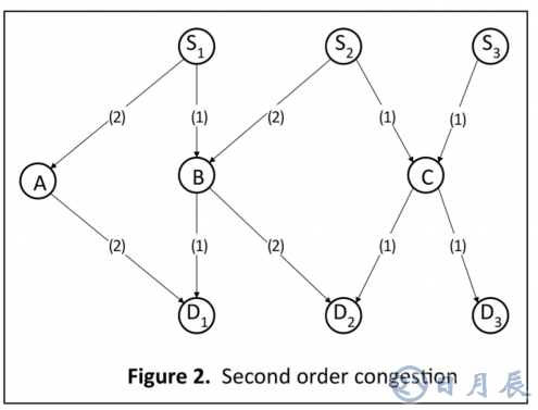 这项工作首先阐述了协商的基本思想,以及处理一阶拥塞的方法。然后分析了二阶拥塞,见下图,并引入了对“历史成本(history cost)”的需求。之后将这个概念进行了推广,并将布线延时引入考量。最后给出了这个算法的伪代码,以及一些实验结果。相比于当时的其他商用工具,这个方法能取得 11%的效果提升。