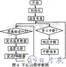 下位机程序框图如图4所示。系统上电后,下位机程序可使单片机不停地采集温度,当上位机向下位机发出命令置位采集标志位时,下位机采集的温度送到上位机的面板并显示,再将所采集的温度数据同预先所设定的温度值相比较,当采集的温度小于设定温度时,根据采集的温度值跟设定温度差值的大小,单片机的P10~P15引脚输 出6路PWM,通过光电隔离TLP521-2和RC滤波电路控制可控硅模块的输入控制电压,改变可控硅模块的导通角,从而改变输出功率。随着采集到的温度值越来越接近设定温度值,单片机输出的PWM值越来越大,导通角越来越小,输出的功率也相应变小,直到采集的温度等于设定温度时,导通角完全关断。同时下位机也可随时响应串口中断,便于用户通过上位机设置或修改设定温度和控制范围。