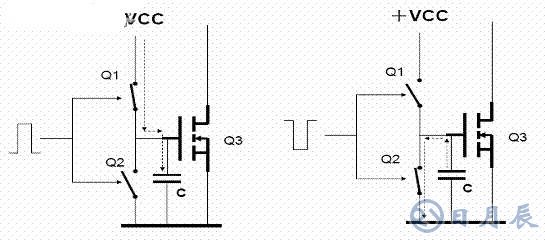 当激励方波信号的正半周来到时;晶体三极管Q1(NPN)导通、Q2(PNP)截止,VCC经过Q1导通对MOS开关管Q3的栅极充电,由于Q1是饱和导通,VCC等效是直接加到MOS管Q3的栅极,瞬间充电电流极大,充电时间极短,保证了MOS开关管Q3的迅速的“开”,如图2-2-A所示(图2-2-A和图2-2-B中的电容C为MOS管栅极S的等效电容)。