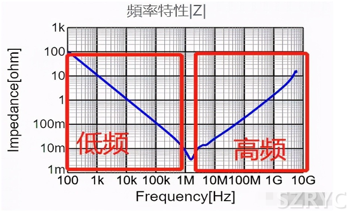 下图是实际电容的阻抗频率特性,我们可以看到在低频段,电容起主导作用,阻抗随着频率增加而降低,然而高频段是电感起主导作用,阻抗随着频率增加而增加,这部分正是我们不希望看到的。