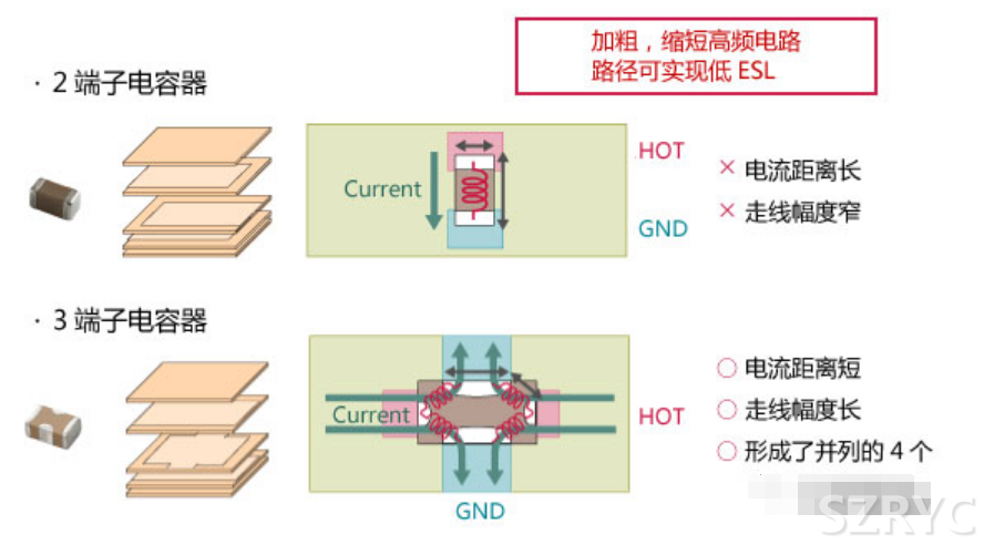那是因为三端子电容结构特殊,缩短了电流路径,使得ESL具有并联的特性,进而减小了ESL,使得高频特性好。