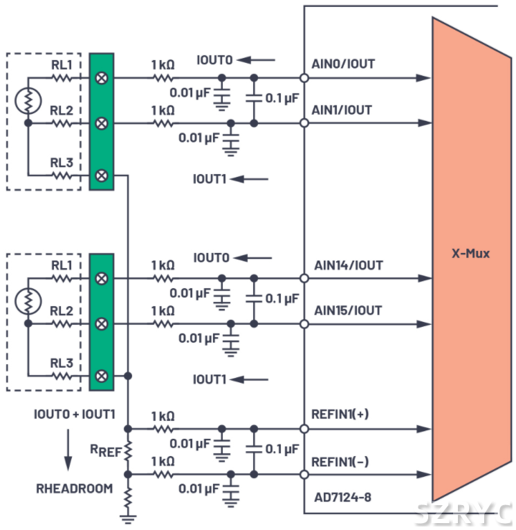 对于本文,AD7124-4/AD7124-8用作ADC。这两款器件是低噪声、低电流精密ADC,集成了PGA、激励电流、模拟输入和基准电压缓冲器。