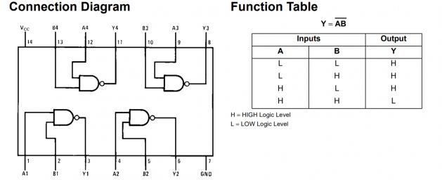 Texas Instruments的SN74LS00N引脚的分配: 1、2输入,3输出; 4、5输入,6输出; 7接地; 9、10输入,8输出; 11、12输入,13输出; 14 接电源。