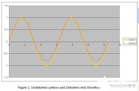 当旁路电容放在PCB的不同位置时,地电流通过不同路径流至各自的旁路电容,即“空间非线性”所代表的含义。若地电流某一极性的分量的很大部分流过输入电路的地,则只扰动信号的这一极性的分量电压。而若地电流的另一极性并没施扰,则输入信号电压以一种非线性方式发生变化。当一个极性分量发生改变而另一个极性没改动时,就会产生失真,并表现为输出信号的二次谐波失真。图2以夸张的形式显示这种失真效果。