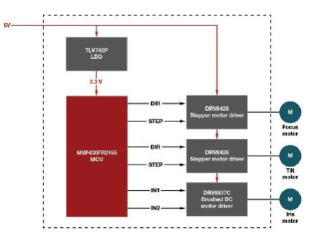 两个DRV8428步进电机驱动器通过精密的细分驱动器(1/256微步进)和电流可调节功能实现焦距和倾斜控制,其作用等同于直流电机。另一个DRV8837C有刷直流电机驱动器用于控制光圈,可保护系统免受短路、欠压和温度过热的影响。该解决方案可提供多种模式,实现超平滑和稳定的运动曲线。