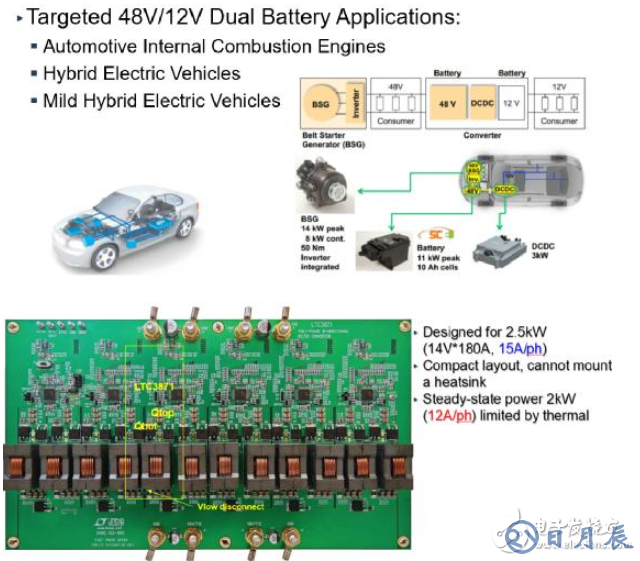 而针对汽车系统中不同电压共存在情况,LTC3871的设计思路就是如Lorry所介绍的,“日益复杂的车载电子功率增加带来的电流增加伴随的更粗的电缆提供更大的电流能力。48V系统的出现是为了优化电缆和车身布线,但是很多系统装备,依然在短期内没法向48V系统迁移,因此相当一段时间内,会出现48V系统和12V系统共存的局面,把一个48V的电池组和12V的电池组连接起来,可以双向供电,并对48V和12V系统进行管理。这样就可以保证在整个汽车系统安全运行的问题。”