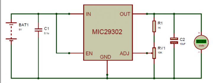 在本项目中,我们将使用 MIC29302 构建LDO 稳压器或低压差稳压器电路。可以使用调节引脚上的高阻值或低阻值电阻来改变输出电压。